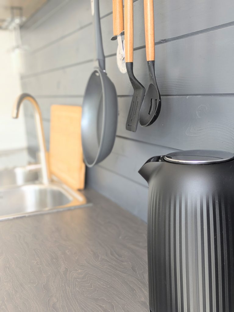 A compact kitchenette with air fryer, fridge, small freezer, and essentials lets you cook simple meals, snacks, or breakfast in bed – no need to go out unless you want to.